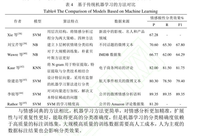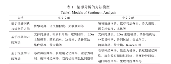 分析总结:面向不同应用场景,主要有基于情感词典与规则、基于传统机器学习与基于深度学习三种文本情感分析方法。近年来基于多策略混合的方法逐渐成为重要的改进方法。主要是从宏观技术角度对方法和应用综述分析。面向商业决策等应用场景有很大的发展潜力。