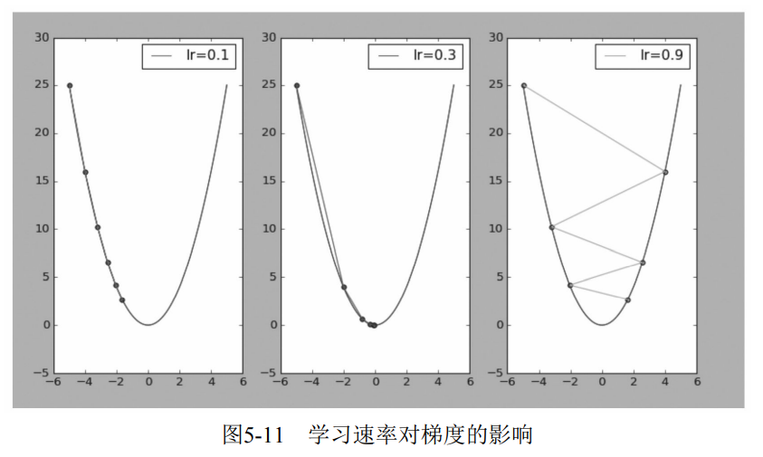 这种梯度更新算法简洁,当学习率取值恰当时,可以收敛到全面最优点 (凸函数)或局部最优点(非凸函数)。但其不足也很明显,对超参数学习率比较敏感(过小导致收敛速度过慢,过大又越过极值点),如图5-11的右图所示。在比较平坦的区域,因梯度接近于0,易导致提前终止训练,如图5-11的左图所示,要选中一个恰当的学习速率往往要花费不少时间。