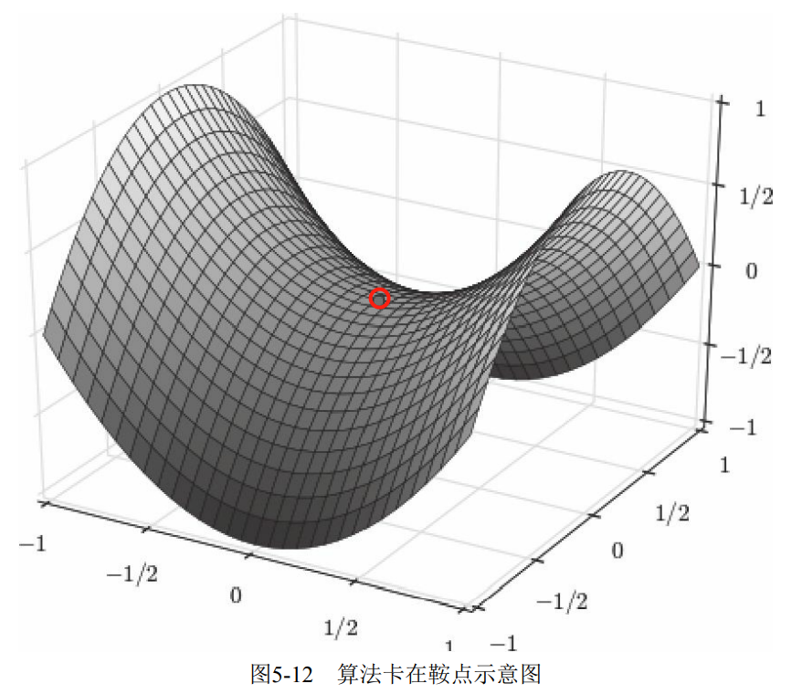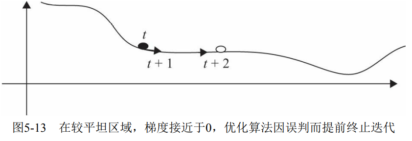 学习率除了敏感,有时还会因其在迭代过程中保持不变,很容易造成算法被卡在鞍点的位置,如图5-12所示。 另外,在较平坦的区域,由于梯度接近于0,优化算法会因误判,在还 未到达极值点时,就提前结束迭代,如图5-13所示。