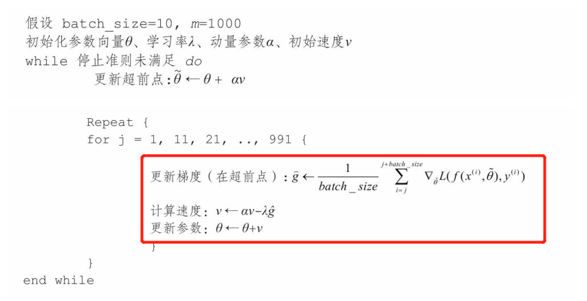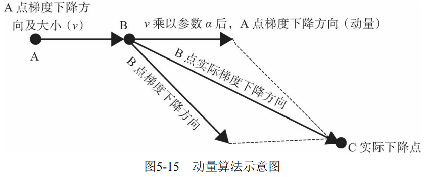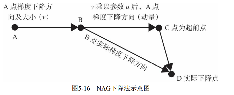 先往前走一步,在靠前一点的位置(如图5-16中的C点)看到梯度,然后按照那个位置再来修正这一步的梯 度方向,如图5-16所示。这就得到动量算法的一种改进算法,称为Nesterov Accelerated Gradient,简称NAG算法。这种预更新方法能防止大幅振荡,不会错过最小值,并会对参数更新更加敏感。