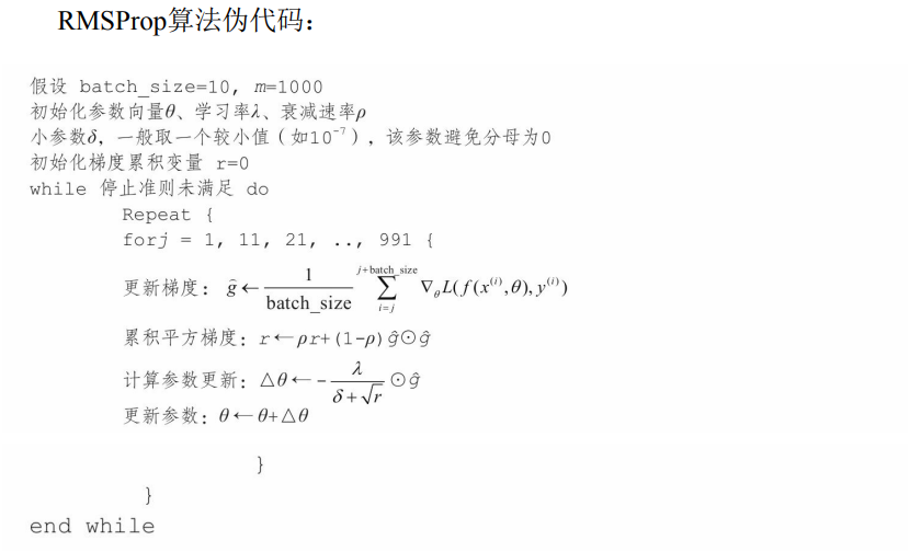 针对梯度平方和累计越来越大的问题,RMSProp指数加权的移动平均代替梯度平方和。RMSProp为了使用移动平均,还引入了一个新的超参数ρ, 用来控制移动平均的长度范围。