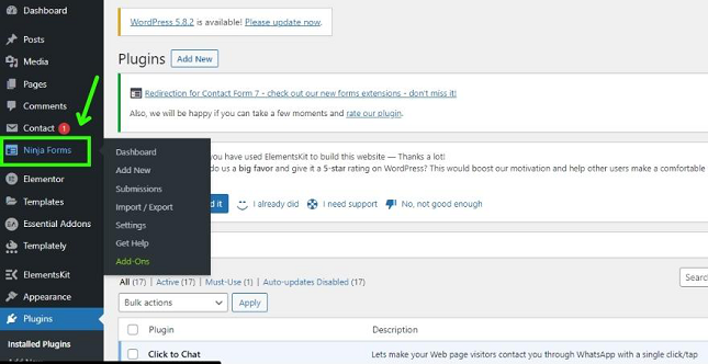 新选项将在你的仪表板上显示为 Ninja Forms。