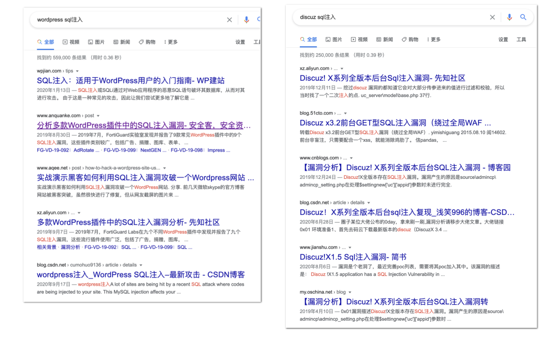 而且建网站,如果不想开发的话,有很多 CMS 框架,尤其 PHP 的很多,现在依旧使用广泛的有 WordPress,当时国内的有 Discuz、DEDECMS 等一批傻瓜建站的 CMS 系统,由于代码都是开源的,而且 WordPress 还支持插件,所以会有很多相关的漏洞爆出来,尤其在多年以前,有了漏洞,想拿下一个网站真是太容易了,即使漏洞已经公布并有了解决方案,但依然有好多网站不及时修补和升级。现在在 Google 中搜索相关的 SQL注入关键词,有很多相关介绍。