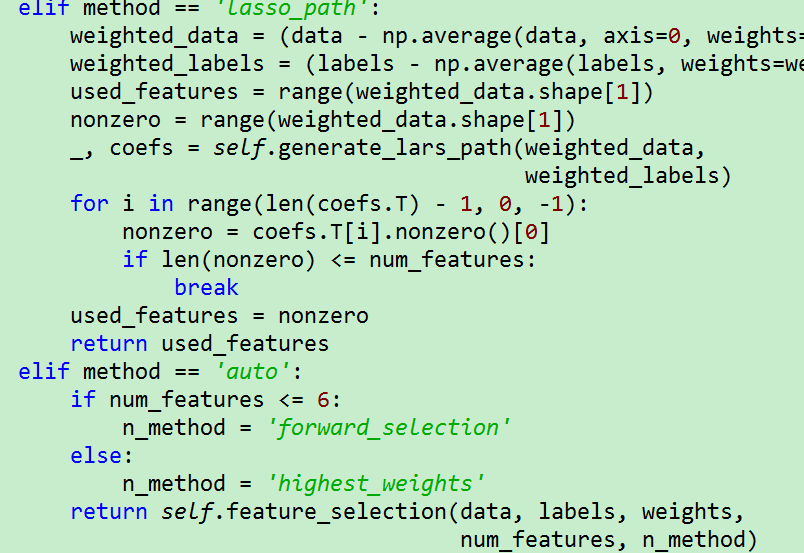 既然是特征选择问题,那我们可以用这些采样样本做个加权回归模型。做回归模型前,先选取k个重要特种,如何选取? 方法是可以是根据回归模型训练结果中最大的权重,或者是前向搜索方法(每次选取使回归模型R^2值最大的特征加入到集合中。),或者采用lasso_path的方法。注意样本的权重是不一样的。
