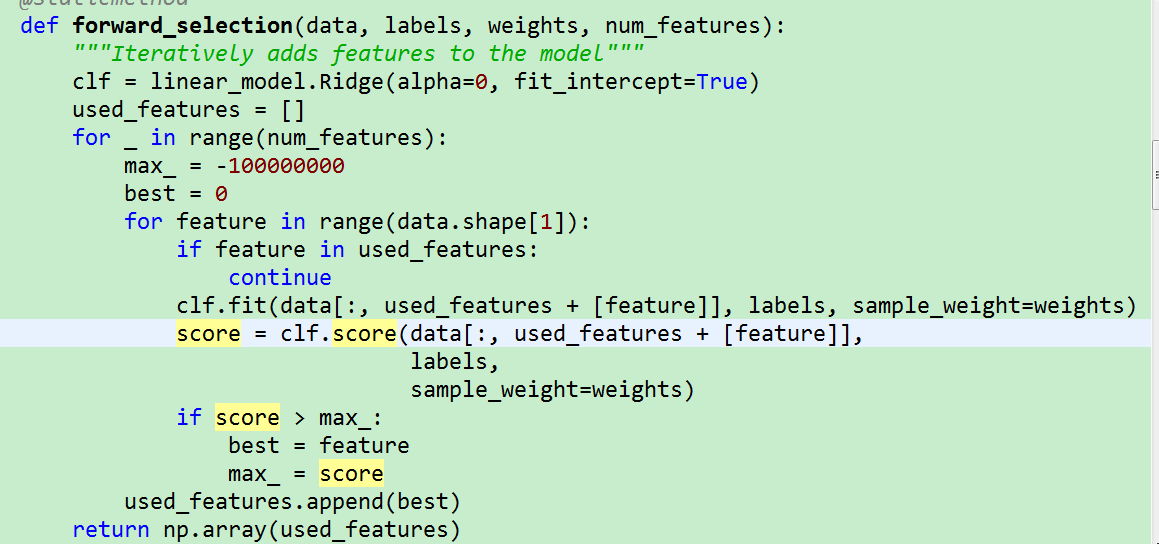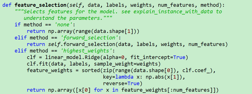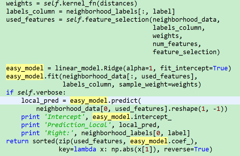 选取K个特征后,我们就可以在采样的样本,以及这K个特征上,做个加权回归模型。回归模型输出的K个特征以及权重,就是分类器对预测样本的解释。下面是explain_instance_with_data函数代码: