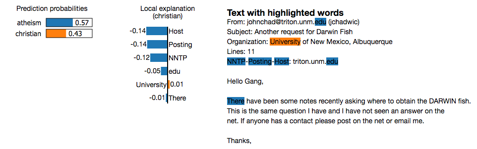 我们在建立模型的时候,经常会思考我们的模型是不是够稳定,会不会出现样本偏差效应, p>>N时候会不会过拟合? 我们检查模型稳定,我们进行一些cross-validation来看看各项评估指标方差大不大。 可是如果样本一开始因为采样偏差导致样本有偏,导致模型和实际情况有差异,这个就不太好评估了。同样,p>>N也会有类似的问题,尤其在文本挖掘领域。一般情况,如果特征不是很多的话,尤其像logistic regression这样的model,我们会把模型权重给打印出来看看,看看训练出的模型结果,是否和人的经验吻合。下面是lime 文章中提到一个文本分类的case,预测一段文本是无神论相关的,还是基督徒相关的。文中分类器预测结果这篇文本是无神论相关的,可是主要区分特征却与人的经验十分不吻合的,这样的模型是不能让人信服的,当我们把这几个特征删除后,预测结果又反向了。我们可以通过人工构建一些由这些特征组成的文本来加入到预测实验中,会大大降低模型性能。