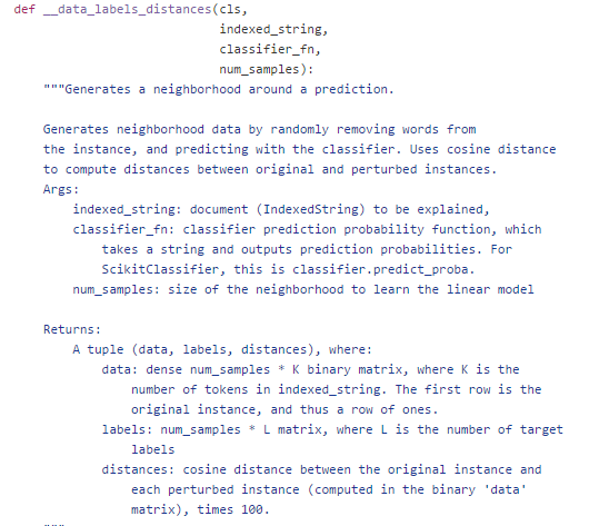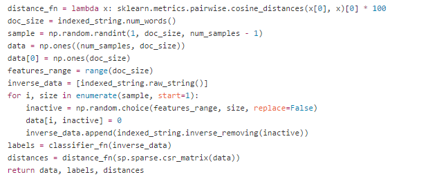 下面是lime_text.py 中__data_labels_distances函数的代码,针对是文本文本分类的解释,下面代码的主要作用如何给预测样本生成近邻采样样本,以及相应权重,采样样本在当前分类器的预测概率。