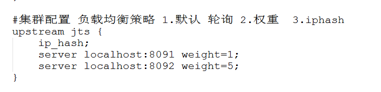 集群的配置`有3种 第一种就是均衡层略局势8091和8092 被访问的次数都差不多 , 第二种就是权重就是weight的值越大出现的次数就越多 ,
