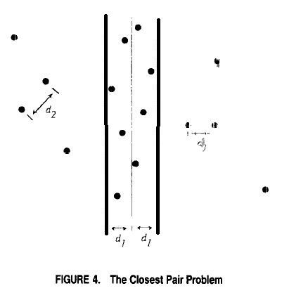 既然我们假设我们能够解决少于n个点的子问题,我们可以把问题缩减为两个含有n/2个点的子问题。我们假设n是2的幂,这样我们总可以把一个集合分成数量两个相等的集合。(我们再后面再讨论这个假设)有很多方法可以把一个点集分成两个相等的部分。我们可以自由选择最好的方法。我们想要从规模较小问题的解法中获得尽可能多有用的信息,因此我们想要在考虑整个问题时尽可能多的保持有效。看起来这里把问题分解为两个不相关各含一半元素的部分是有道理的。当我们找到每个子集中最小的距离后,我们只需要关心那些靠近集合边界的点之间的距离。距离来说,对所有点进行排序最简单的方法是按照它们的x坐标进行排序,把平面用一条垂直线进行分割从而把集合一分为2(见图4)。(如果有一些点位于垂直线上我们任意把它们分配给两个集合中的一个,从而确保两个集合有相等的元素)我们选择这样划分的原因是使得合并解答时要做的工作尽可能少。如果这两个部分以某种方式交叉着,那样会使得对最近对点的检查变得更复杂。排序需要仅被执行一次。
