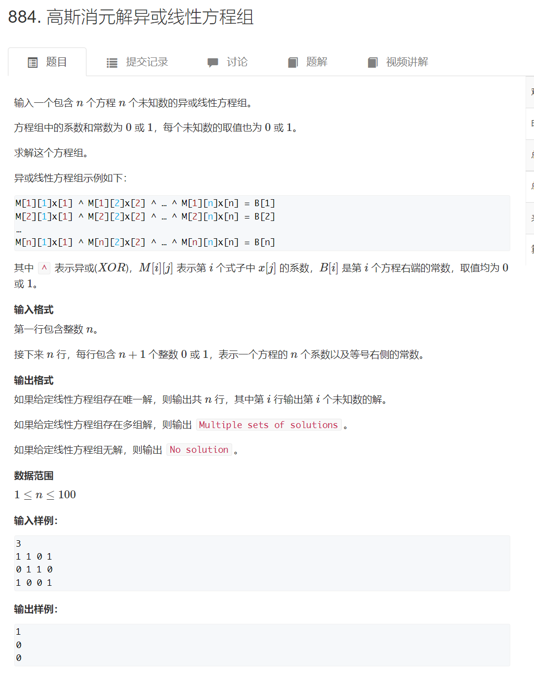 异或运算又称为不进位加法,可以把异或方程组看成一个线性方程组来求解。