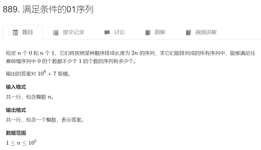 $$ C_{2n}^n-C_{2n}^{n - 1} = frac{(2n)!}{n!n!} - frac{(2n)!}{(n - 1)!(n + 1)! } \= frac{(2n)!(n+1)-(2n)!n}{(n + 1)!n!}=frac{(2n)!}{(n + 1)!n!} = frac{1}{n + 1}frac{(2n)!}{n!n!}\=frac{1}{n + 1}C_{2n}^n $$ 这个数我们称为卡特兰数!很多问题的方案数都是卡特兰数,合法的括号(只有一种括号)的数目就是卡特兰数。