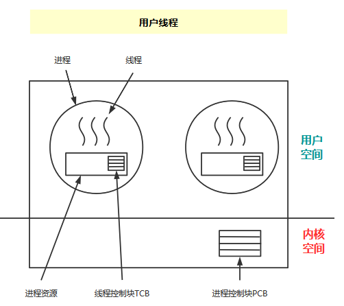 每个进程都需要它自己私有的线程控制块列表,用来跟踪记录它的各个线程的状态信息(PC,栈指针,寄存器),TCB由线程库函数来维护;