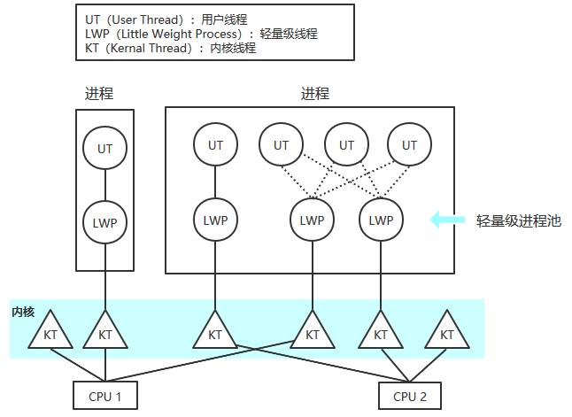 轻量级进程:它是内核支持的用户线程模型,一个进程可以有多个轻量级进程,每个轻量级进程由一个单独的内核线程来支持。