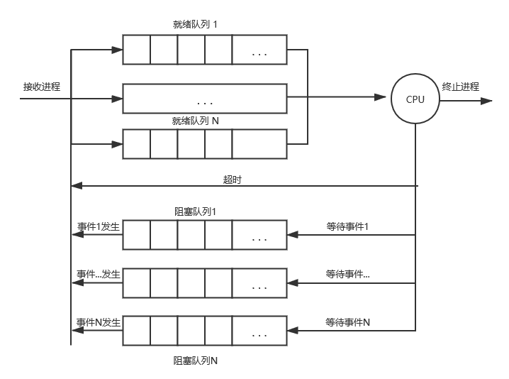 注意图中同一种状态为什么有多个队列呢?因为进程有优先级概念,相同状态的不同队列的优先级不同。