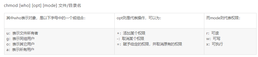 下表为可以设置的权限项目和格式要求,其中<permission>必须是r (read), w (write),and x (execute)的组合形式。