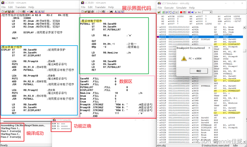 通过本次实验尝试运用LC3实现Nim游戏,首次尝试运用子程序结构进行代码编写,同时完成了界面实现。在该过程中我意识到对返回地址的保护(调用者保护)的重要性,尤其在嵌套调用子程序时。另外也要注意字符和数字的类型转换。以及do-while的运用避免0时仍输出。