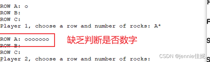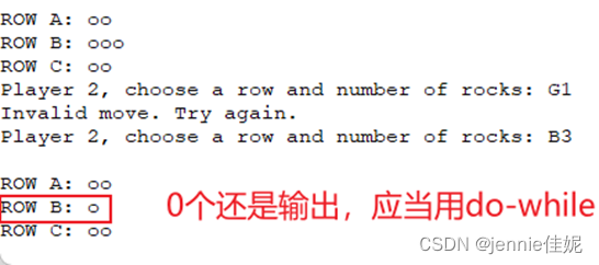 ⑶ 为了指定要移除哪一行中的多少石头,玩家应该输入一个字母后跟一个数字(输入结束后不需要按Enter键),其中字母(A,B或C)指定行,数字(从1到所选行中石头的数量)指定要移除的石头的数量。你的程序必须要确保玩家从有效的行中移除有效数量的石头,如果玩家输入无效,你应该输出错误提示信息并提示该玩家再次进行输入。例如,如果轮到玩家1: