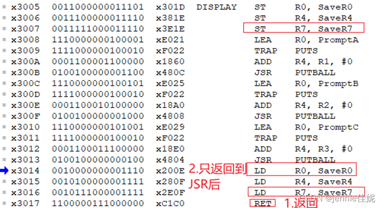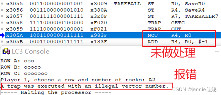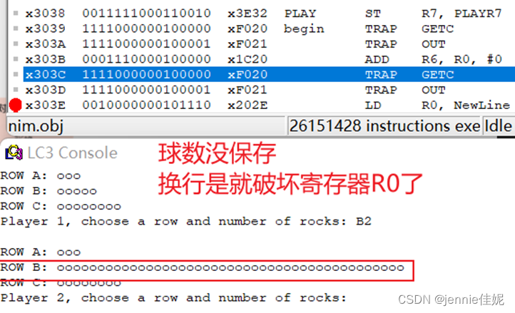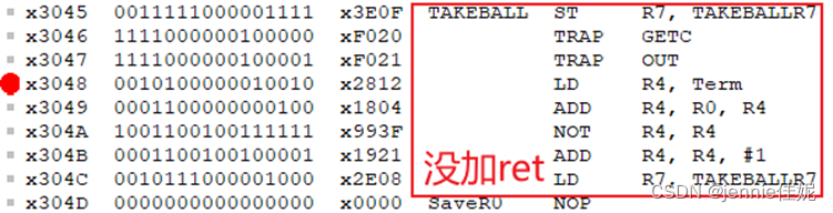 球数输出出错,一直输出,经调试是输出球的子程序返回报错,无法正常返回。它返回到该子程序调用的OUT的下一行代码,说明R7返回地址在嵌套调用TRAP服务程序时已被修改破坏,无法正常返回。这说明我应当做到调用者保护R7,调用前应当保护R7原值。