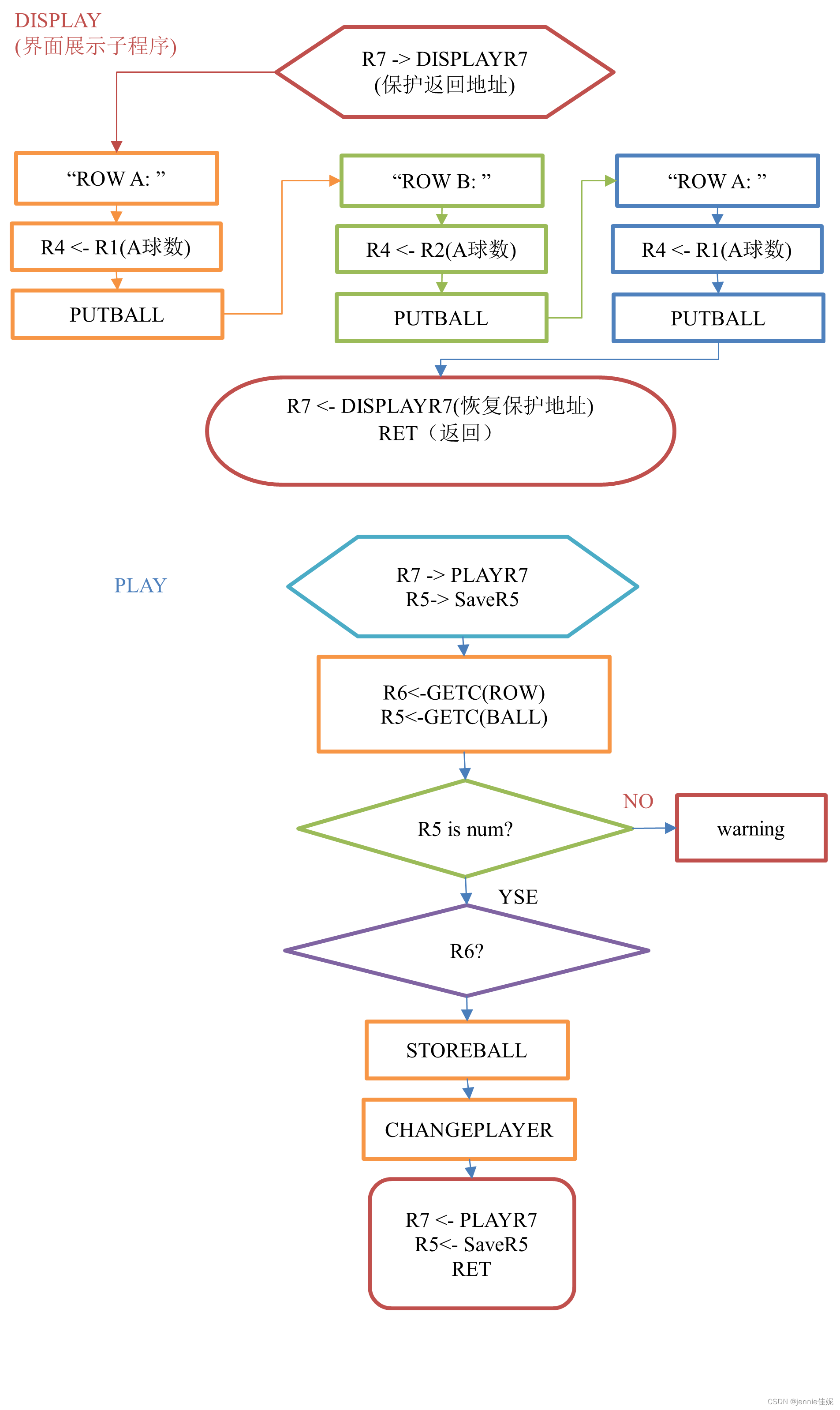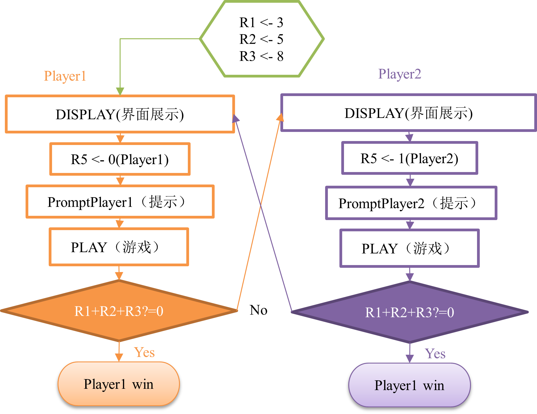 每轮游戏包括2名玩家分别玩(调用PLAY子程序)。R5记录玩家身份,0为玩家1(Player1),1为玩家2(Player2),以便警告后可以正确返回到对应玩家重新开始以及判断胜负。每人每轮结束进行胜负判断,看总球数是否为0判断是否胜出。