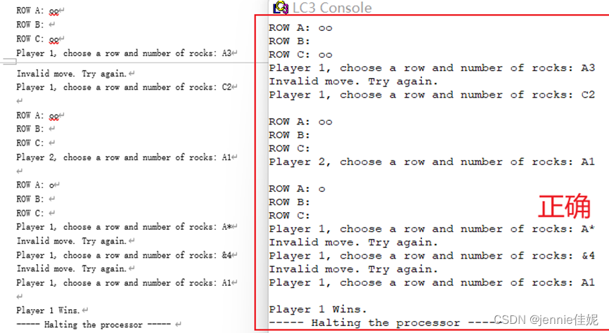 ROW A: oooROW B: oooooROW C: ooooooooPlayer 1, choose a row and number of rocks: B2ROW A: oooROW B: oooROW C: ooooooooPlayer 2, choose a row and number of rocks: A1ROW A: ooROW B: oooROW C: ooooooooPlayer 1, choose a row and number of rocks: C6ROW A: ooROW B: oooROW C: ooPlayer 2, choose a row and number of rocks: G1Invalid move. Try again.Player 2, choose a row and number of rocks: B3ROW A: ooROW B:ROW C: ooPlayer 1, choose a row and number of rocks: A3Invalid move. Try again.Player 1, choose a row and number of rocks: C2ROW A: ooROW B:ROW C:Player 2, choose a row and number of rocks: A1ROW A: oROW B:ROW C:Player 1, choose a row and number of rocks: A*Invalid move. Try again.Player 1, choose a row and number of rocks: &4Invalid move. Try again.Player 1, choose a row and number of rocks: A1Player 1 Wins.----- Halting the processor -----