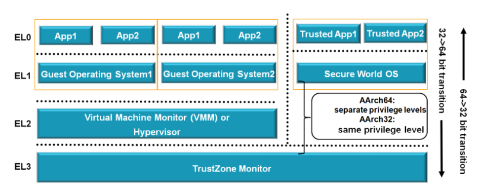 - 如果没有支持两个security state(但是支持虚拟化),那么ARM64有3个exception level,分别是:EL0(对应user mode的application),EL1(guest OS)和EL2(Hypervisor)。