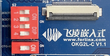 OK-G2LD-C开发板支持TF卡烧写,支持SCIF和Flash启动(暂不支持eMMC启动),底板拨码旁边的丝印就是不同状态时的拨码位置,可直接按照丝印进行拨码。如下图所示拨码开关为Flash启动: