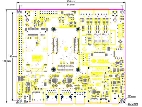得益于集成式的电源方案,整个核心板尺寸可以控制得非常小,仅有60mm x 38mm。在板对板超薄连接器的加持下,核心板到底板最高的部分(电感)距底板表面仅有5.6mm。适用于对空间要求苛刻的应用场景。核心板采用沉金加树脂塞孔的工艺,大大提升了焊接的可靠性以及稳定性。并采用无铅工艺,符合环保要求。同时,对信号完整性以及电源完整性进行了严格把控,通过仿真,为系统稳定运行提供理论依据;核心板的4个角预留固定孔位,以应对高强度震动场景;此外还具有更为人性化的防呆设计。