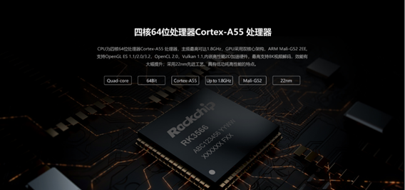 | CPU | 四核64位Cortex-A55处理器,22nm先进工艺,主频最高1.8GHz |