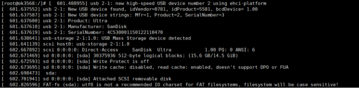 下面先测试USB2.0的接口,插入U盘,打印信息如下: