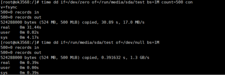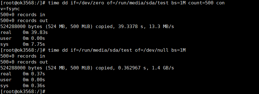# time dd if=/dev/zero of=/run/media/sda/test bs=1Mcount=500 conv=fsync