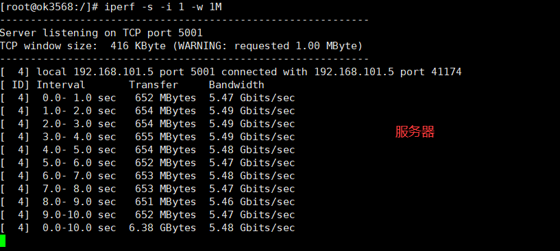 下面以TCP为例进行测试,这里测试的是ETH0。先打开服务器:# iperf -s -i 1 -w 1M