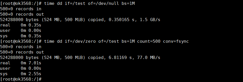 # time dd if=/dev/zero of=/test bs=1M count=500 conv=fsync