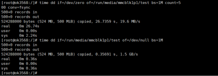 OK3568-C使用闪迪的eMMC,读写速度测试命令如下: