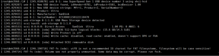 下面测试USB3.0的接口,USB3.0和OTG复用,通过拨码开关切换使用,使用USB3.0接口时请确认拨码开关在ON位置,插入U盘后,打印信息如下: