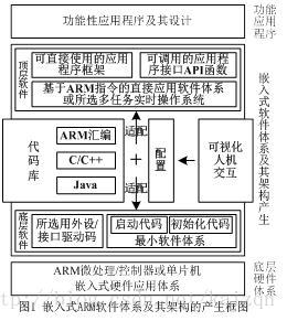 嵌入式软件体系架构,与硬件密切相关,又称为硬体操作软件或者基于硬体的软件,其开发设计包括基本软件体系的构造、底层外设或接口驱动程序的设计、IDE/E-RTOS系统的建立等一系列繁琐的过程,也可以是这些部分的有机整合---可编程片上系统设计SoPC。为彻底简化这一过程,实现上述目标,该“ARM系列微处理器软件体系架构工具”,立足于嵌入式ARM硬件体系,通过简单易用的可视化人机交互进行“量体裁衣”的定制,得到基于具体ARM型号微处理/控制器类型的“实际配置”,结合内嵌的广泛而丰富的“代码数据库”,经过逐级的“适配与优化”,进而,向下形成由含有基本的启动代码、系统初始化代码在内的最小软件体系和所用外设和接口驱动程序组成的底层软件,向上形成由基于ARM指令集的直接软件体系或所选多任务E-RTOS的板级支持包BSP(Board Support Board)、可调用的应用程序接口API(Application Programmable Interface)函数库和可以直接使用的应用程序框架组成的顶层软件。有了具体的可靠高效的嵌入式ARM软件体系框架,软件工程师,就可以直接在此程序框架的各个“用户可以加入代码”的注释处,调用所产生的API函数,进行功能性应用程序设计了。嵌入式ARM应用系统,特别是其软件体系及其架构的设计层次与流程如图1所示。