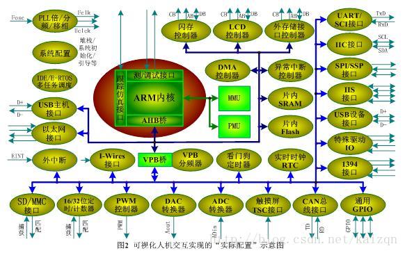“选配”实现的大部分功能示意在图2中,其中PLL为锁相环(Phase Locked Logic),INTC为异常/中断控制器(Interrupt Controller)、EMIC为外部存储器接口控制器(External Memory Interface Controller)、闪存控制器为(Flash Memory Controller)、DMA为直接存储器访问(Direct Memory Access)、MMU/PMU为存储器/电源管理单元(Memory Management Unit/Power Management Unit)、UART/SCI为通用异步收发器(Universal Asynchronous Receiver Transmitter)/串行通信接口(Serial Communication Interface)、SPI为串行外设接口(Serial Peripheral Interface)、I2C为内部集成电路接口(Inter-Integrated Circuit)、USB为主机/设备通用串行总线(Host/Device Universal Serial Bus)、LCD为液晶显示器(Liquid Crystal Display)、I2S为数字音频总线(Inter-IC Sound Bus)、SD/MMC为安全数据卡/多媒体控制器(Secure Digital Card/Multimedia Control)、EMAC为以太网接口控制器 (Ethernet Media Access Controller)、CAN为控制器局域网(Controller Area Network)、TSC为触摸屏控制器(Touch Screen Controller)、PWM为脉冲宽度调制(Pulse Width Modulation)、WDT为看门狗定时器(Watch Dog Timer)、RTC为实时时钟(Real Time Clock)、ADC为模数转换器(Analog Digital Converter)、DAC为数模转换器(Digital Analog Converter)、GPIO为通用输入/输出接口(General Purpose I/O),AHB指先进的高性能总线(Advanced High performance Bus),APB指先进的外设总线(Advanced Peripheral Bus)。