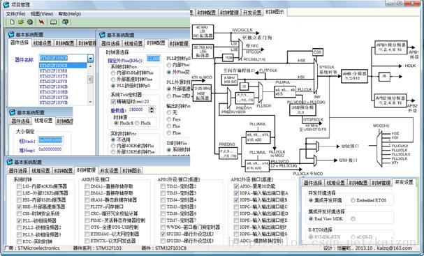 基本系统设置包括微处理器选择、堆栈设置、时钟管理与管理、开发环境的选择等,设置各种时钟是关键,特地给出了“时钟图示”。在图5中,点击方形桔黄色按钮,即可打开相应的窗口界面及其页面,展开相应的配置,如图6所示。