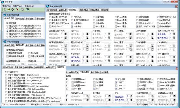 STM-CortexM3微处理器的外设/接口,主要是片内集成的设备或接口控制器,部分高性能外设或接口直接挂在总线阵列上,其它多数外设或接口通常连接在高性能总线AHB和低速外设总线APB上。APB总线上的外设或接口又有高低速之分。片外的设备或接口,通常挂在微处理器的GPIO接口或外存控制器接口上,可通过对GPIO或外存控制器的操作来实现。在图5所示的软件总体架构窗口界面上,找到并点击所需的外设或接口按钮,即可打开相应的配置窗口,通过相应的选择或设置,进而完成相应的寄存器配置和底层硬件驱动操作的软件代码架构。