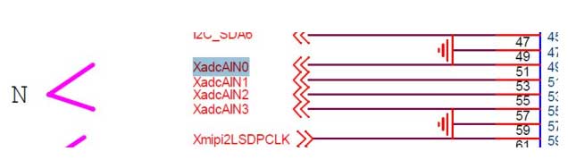 如下图所示,是底板和核心板连接器,可以看到 XadcAIN[0:3],这四路都引到底板。