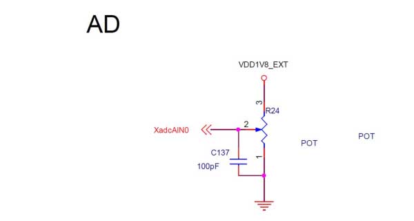 如下图所示,这是开发板自带的 ADC 电路,ADC 接的是滑动变阻器,网络标号是