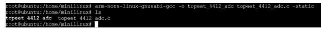 none-linux-gnueabi-gcc -o topeet_4412_adc topeet_4412_adc.c -static”编译,如下图