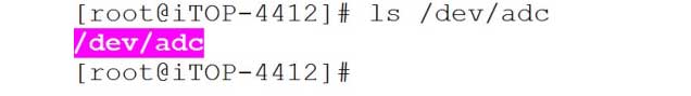 如下图所示,在开发板控制台中,使用命令“/dev/adc”,可以看到 adc 的设备节点。