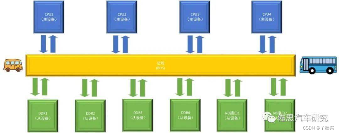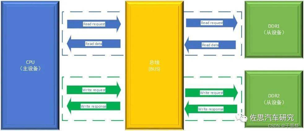 随着对运算能力(计算速度和计算规模)需求的不断提高,在单核CPU无法满足计算需求的情况下,多核CPU计算机系统应运而生。目前的芯片系统中通常会包含多个CPU、DDR和外设,即总线上连接有多个主设备和多个从设备,各个CPU都可以使用总线访问DDR。总线的英文名称“BUS”形象地描述各位“乘客”(各个主设备的请求)都可以乘坐“BUS”去往相应的“目的地”(从设备),从设备的响应也可以通过总线返回对应的主设备,此时总线可以理解为共享的信息通路,总线把各个组件需要传递的信息运送到相应的目的地。