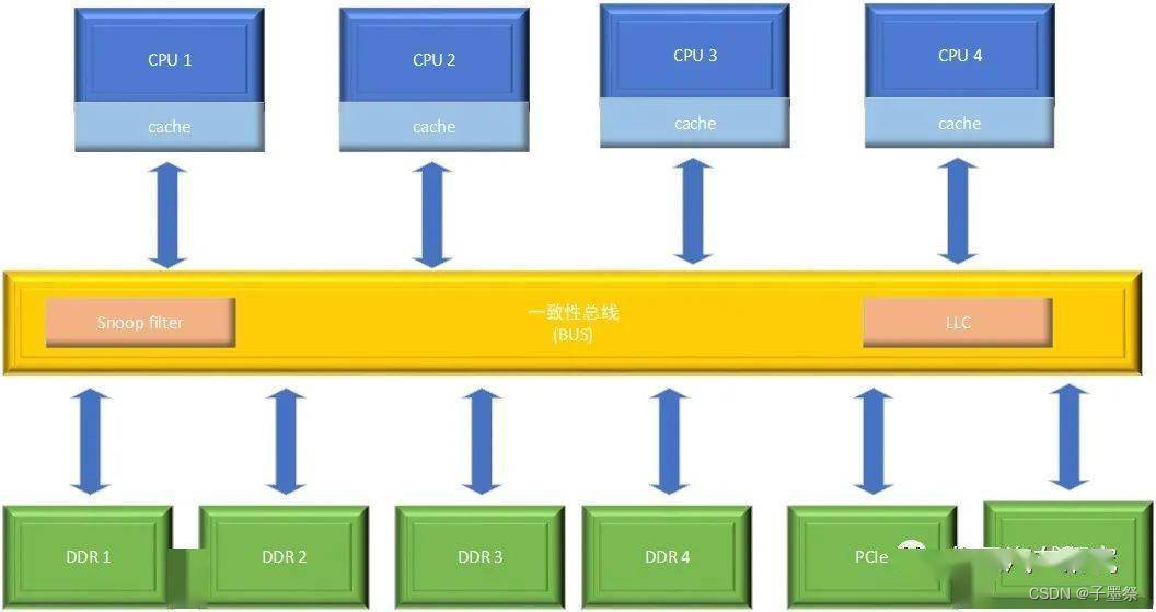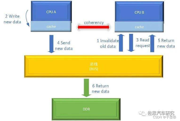 我们基于MOESI cache一致性协议假设:CPU A、CPU B以及DDR都保存有同一cache line数据,如果CPU A想要对此cache line中的数据进行改写,那么总线会先使CPU B中的该 cache line无效,之后CPU A再对其cache line进行改写,此时DDR中该cache line的数据也成为了旧的不可用数据,如果CPU B需要使用该cache line的数据就需要向总线发起读请求重新获取新的数据,总线从CPU A的cache中获取改写后的新数据并发送给CPU B的cache;当CPU A和CPU B的cache不再保留该cache line时需要通过总线将其写回到DDR中。可以看出此时的总线具有管理各CPU cache一致性的功能,被称为一致性总线(Coherent Bus)。