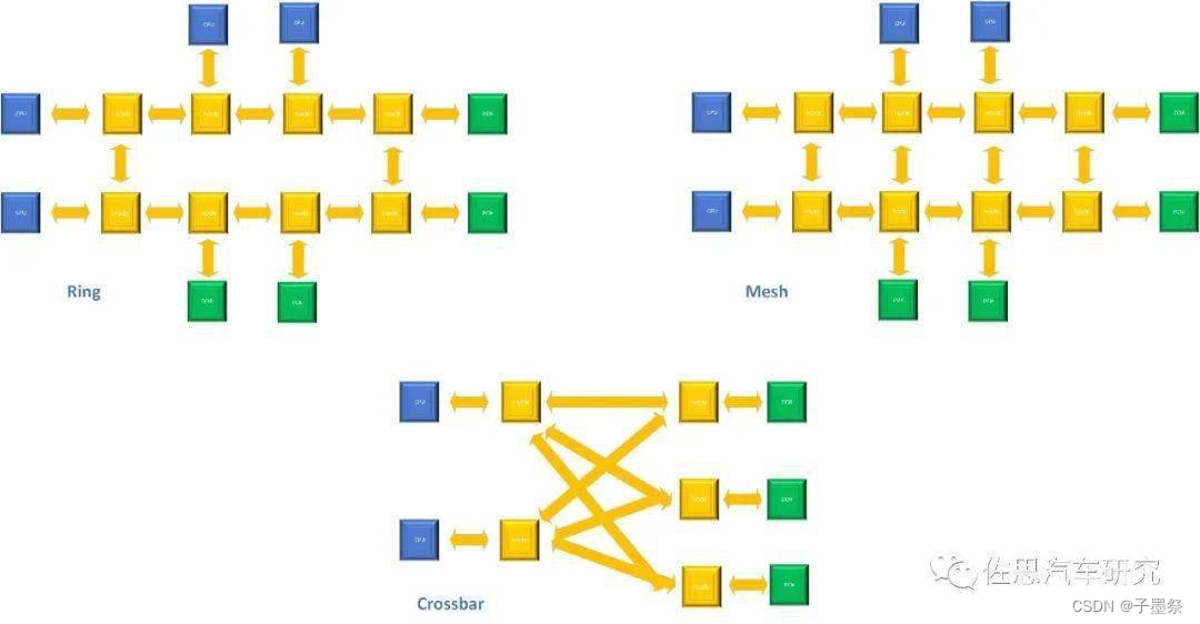 - 交叉连接(Crossbar) 。这种拓扑允许每个节点连接到每个可能的节点。这种设计提供了最好的性能,因为每个组件都与需要通信的组件有直接连接。这种拓扑的缺点是连接所有组件的需要很大的资源开销。这是因为每增加一个组件,系统中所需的信号线数量都会显著增加。因此,拓扑最适合于小型系统。
