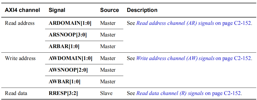 ACE和AXI4的差异主要在以下几个方面,首先是在AXI4读写通道增加如下图所示信号。AxDOMAIN用于指示读写传输的可共享域,AxSNOOP用于指示可共享的读写传输类型,RRESP[3:2]用于可共享读传输的读响应。
