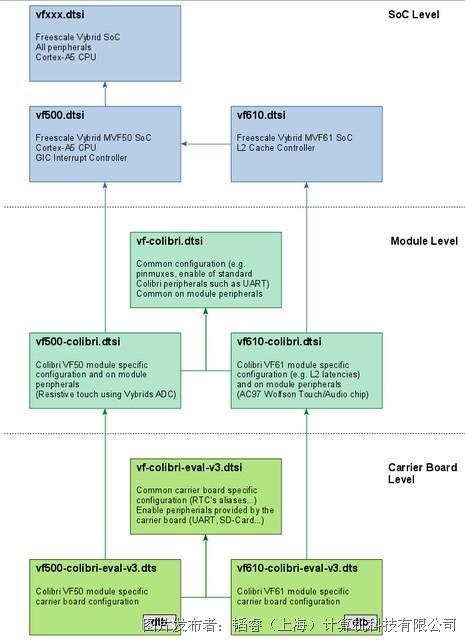 本文以Colibri VF61计算机模块和Eva board载板为例,定制设备树文件以使能GPIO和CANbus。Colibri Vybird系列产品设备树文件的架构如下图所示: