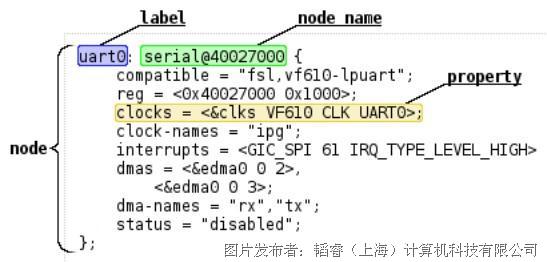 设备树文件的基本单元是node,一个设备树文件只能有一个root node (/),其他node按照parent/childnode以树状结构分布,每个node里面包含一些property/value来描述该node特性,如下面是一个UART设备的描述;另外低级别设备树文件的定义可以在更高级别的设备树文件中重新定义或者更改,最后生成的二进制文件以最后一次定义为准,因此我们定制化设备树文件时候通常只定制修改最高级别的载板级设备树文件即可;更详细的关于设备树文件语法的说明请见这里。