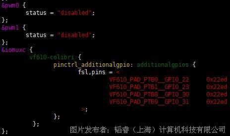 b).编辑设备树文件vf610-colibri-my-carrier.dts,将默认配置为PWM设备管脚配置为GPIO