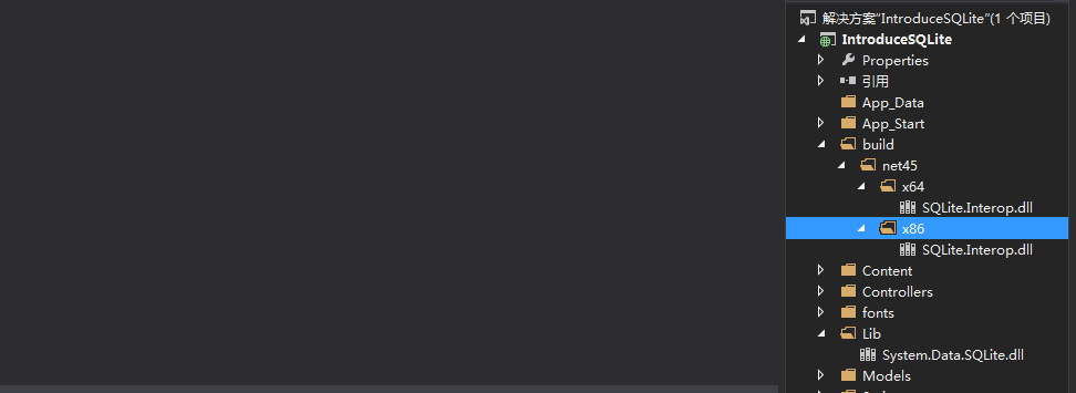 (2)关于建立空MVC项目在里面建立SQLite,不能将【SQLite.Interop.dll】和【System.Data.SQLite.dll】放在同一文件夹中,需要将【SQLite.Interop.dll】程序集放在x86或者x64文件夹中且文件夹名字不能更改。